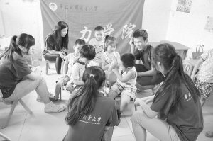 7月初,华北水利水电大学20多名大学生来到周口,就留守儿童的生活、学习、心理等问题进行社会调查,充分了解了留守儿童群体出现的原因、现状以及社会各界如何为他们提供最合理的关怀等。图为华北水利水电大学电力学院暑期社会实践队在沈丘县娃娃城幼儿园,与留守儿童一起做游戏。任宇杰 摄