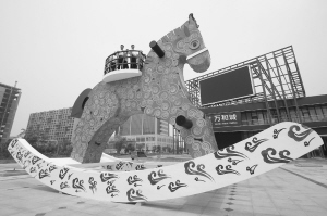 7月8日,参观者在山东临沂经济技术开发区观看巨型“摇木马”。这座巨型“摇木马”由临沂艺术家曹淑春设计,高度超过8米、宽度超过4米、长度达到12米,木马色彩鲜艳明丽,造型简洁流畅,充满云纹、青花瓷图案等中国特色元素。新华社 发