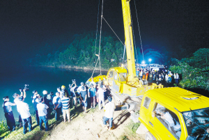 在救援潜水员仔细排查后,11日1点35分,事故校车的落水位置最终确定。凌晨3点左右,事故车辆终于被打捞出来。记者看到一辆黄色的普通7座面包车,车顶装有报警灯,前挡风玻璃已破碎。