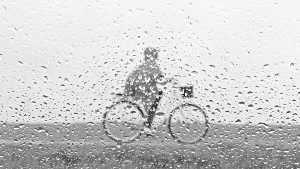 雨的画 7月9日,在德国南部的赖希林,一名身披红色雨衣的女子在雨中骑车。