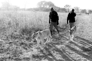 与狮为伴 7月6日,在津巴布韦羚羊公园,饲养员带着13个月大的小狮子散步。在南部非洲国家津巴布韦,与狮漫步是一个旅游项目,开始于10年前。