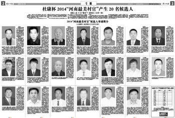 “做一盏明灯,亮一方村庄”是他们的座右铭,在2014“河南最美村官”评选活动中,我们走近村官,发现他们的美丽,体会他们的奉献。在20位候选人中,您为谁感动?即日起,登录大河网www.dahe.cn或剪下报纸上的选票,为您心中的最美村官投票。
