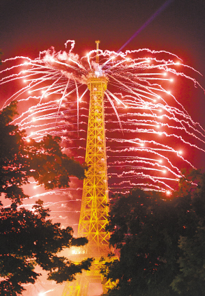 7月14日晚,法国巴黎市政府在埃菲尔铁塔施放焰火庆祝法国国庆。
