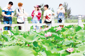 第八届中国·淮阳龙湖赏荷旅游月活动启动以来,碧波荡漾的万亩龙湖,朵朵荷花娇艳,迎来众多八方来客。图为游客在观赏盛开的荷花。 (记者 金月全 摄)