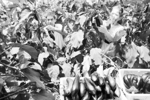 商水县宏德天宇生态园区培育的航天蔬菜外形奇特、营养价值高、口感好,亩产12000余斤,吸引成千上万的游客观赏、采摘。图为该生态园区的钟点工在采摘佛手茄。 (王新建 摄)