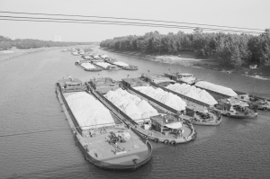 满载货物的货船在沈丘县沙颍河段等待开闸放行。近年来,随着内陆城市化建设迅速膨胀、工业化承接产业转移急速加快,大件物品、大宗货物多选择价格低廉的水运输出,沈丘县沙颍河段航道已成长为年吞吐量达996万吨的黄金水道,航运可入淮河、汇长江,通达南京、上海,是中原腹地连接华东地区的重要门户。