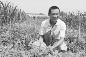 昨日,商水县张明乡庞楼村转业军人王金现在采摘晚茬西瓜。王金现流转土地500余亩,创办了民生源无公害蔬菜种植农民专业合作社,以种植西红柿、紫红薯等高产高效经济作物为主,在实现自己增收致富的同时,还安排村里50余名留守老人在合作社上班,使老人们在家门口就能打工挣钱。(刘飞 摄)