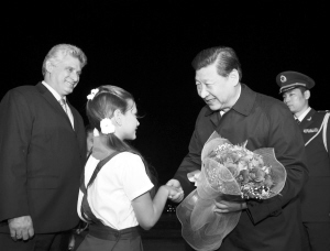 当地时间21日晚9时许,习近平乘坐的专机抵达哈瓦那何塞·马蒂国际机场。习近平受到古巴国务委员会第一副主席兼部长会议第一副主席迪亚斯-卡内尔热情迎接。古巴少年向习近平献花。