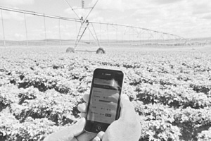 近年来,河北省沽源县引进先进技术,将手机智能灌溉系统应用于大型喷灌机上。通过智能手机远程操控灌溉系统的水泵、施肥罐、电磁阀等设备,实现水、肥、药一体化控制,使灌溉不受空间和距离的限制。图为种植户正在利用手机操作喷灌机。 牟宇 摄