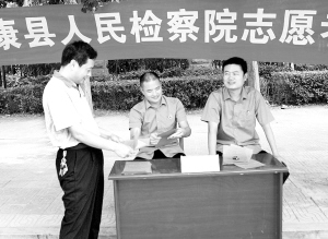 7月27日,太康县人民检察院干警在设立的咨询台前为群众讲解有关法律问题。该检察院组织干警走街道、进社区、下企业,开展“践行价值观、文明我先行”主题宣传活动。检察干警结合实际案例,在“水岸名家”社区向群众讲解社会保障、婚姻家庭等方面的诸多问题,在县锅炉厂,向企业管理者和员工讲解知识产权保护、劳动合同签订、员工离职等过程中应注意的法律问题,并为企业送去法律法规书籍60多册。当日,“检察官志愿者服务队”放弃休息,顶着烈日走上街头,宣传法律知识,向过往群众发放宣传资料2000余份,接受群众法律咨询20余人次。(记者 徐如景 通讯员 郑亮 袁卫云 摄)