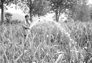鸣鹿办事处李桥村村民李喜峰在玉米地浇水抗旱。连日高温少雨天气,农田旱情严重,鹿邑县组织农民全力抗旱,一场战高温抗旱保秋在全县如火如荼地进行,力争在夏粮丰收的基础上,夺取秋粮丰收。
