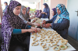 7月28日,在加沙城一所联合国学校,在此避难的巴勒斯坦妇女正在制作开斋节传统美食。当天,巴勒斯坦穆斯林在战火中迎来一年一度的开斋节。新华社发