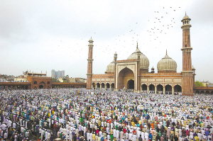 7月29日,穆斯林在印度老德里的贾玛清真寺做礼拜。当日,印度穆斯林参加礼拜、享用美食,迎接开斋节。新华社记者 郑焕松 摄