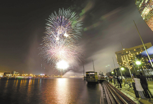 7月28日,在阿联酋迪拜运河河畔,人们在观赏为庆祝开斋节燃放的焰火。当日,阿联酋迎来伊斯兰教传统节日开斋节。新华社发