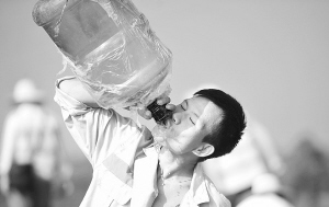 7月30日,在皖赣铁路江西乐平段,一位护路工人在休息时举起一大桶水喝了起来。新华社发