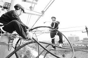 昨日,郸城县电业局职工冒着高温对10KV金丹线路进行改造,及时消除供电隐患,确保群众抗旱用电。