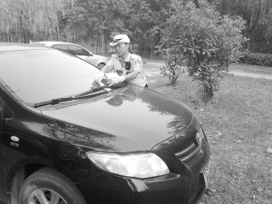 一辆违规停在绿地上的车辆被交警贴上罚单。
