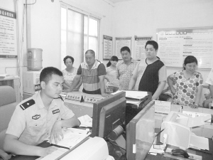 7月30日13时许,记者慕名来到沈丘县公安局河北派出所,耳闻目睹了所长毛前进身先士卒,为群众答疑解惑。民警积极热情的服务态度和耐心细致的工作作风,赢得前来办事群众的好评。最近,需要办理第二代居民身份证、户口及各类证明的学生和外出务工人员剧增,该所坚持以人为本的工作理念,创新服务举措,提升服务质量,采取不分双休日、加班加点等多项应对措施,迎战办证高峰,针对需要办理有关业务的留守老人、留守妇女、残疾人等,优先、上门为其办理,最大限度地为群众提供方便,缩短等待时间,减少群众在暑天中的往返次数。(记者 徐如景 摄)