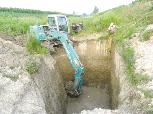昨日,商水县舒庄乡一台挖土机正在河道里加深土井深度。连日来,商水县旱情严重,河水干枯,部分机井水位下降无法使用。(乔连军 摄)