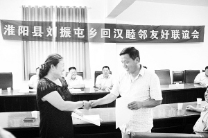 8月5日,淮阳县24个少数民族聚居村和邻近汉族村缔结了50对友好村邻。图为刘振屯乡回汉睦邻友好联谊会上,方庄少数民族聚居村和近邻王三楼汉族村代表签订“友好村邻”协议书后,双方握手。 (记者 侯俊豫 摄)