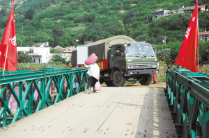下图:8月6日,一辆救灾车辆正在通过新架成的龙泉河桥。通往震中龙头山镇的“咽喉桥”——龙泉河桥8月5日晚顺利架成,这标志着鲁甸地震发生后一直中断的通往震中的道路终于打通。鲁甸地震发生后,龙泉河桥垮塌,致使灾区与外界的联系中断,救援人员只能徒步进入灾区,大批救援物资被堵在途中。 (新华社发)