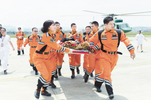 上图:8月6日,在云南省昭通机场,救援人员在转运伤员。当日,鲁甸地震进入“黄金72小时”的最后一天,目前各项抗震救灾工作正在全力展开。截至8月6日10时30分,地震造成589人死亡,108.84万人受灾。 ( 新华社发)