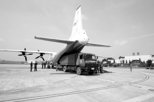 在云南昭通机场,官兵在运输机抵达后迅速卸载物资。