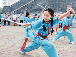 8月8日,孩子们在公园练习武术。当日是我国第六个全民健身日,各地市民以练习健身操、武术、瑜伽等方式快乐运动,享受生活。(新华社发)