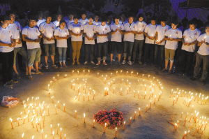 8月8日,人们点燃蜡烛,悼念逝者。当日,一些鲁甸地震遇难者家属与志愿者聚集在云南鲁甸县龙头山镇骡马口缅怀逝者。(新华社发)