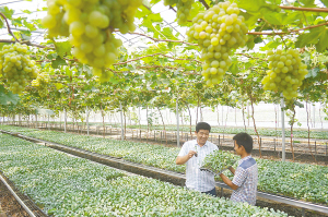 扶沟县蔬菜研究院充分利用大棚空间,采用立体模式进行蔬菜育苗和葡萄种植,用葡萄架为蔬菜苗遮阴,效果良好。图为管理人员正在察看菜苗长势。