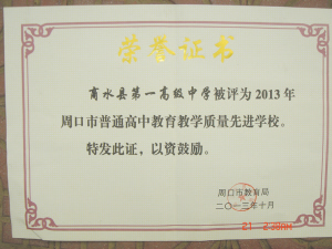 近几年来,凭借先进的办学理念、高素质的教师队伍、把握时代发展脉搏的教育改革,商水一高教育教学收获了累累硕果,先后获得“省级文明单位”、“省级卫生先进单位”、“省级先进家长学校”、“市教育教学先进单位”、“市基础教育教学教研工作先进学校”、“周口市五四团委”等多项荣誉;同清华大学、北京大学、中国科技大学、北京师范大学、北京理工大学、武汉大学、郑州大学等建立了密切联系,是这些名校的优质生源基地。