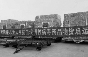 8月10日,我国政府援助非洲抗击埃博拉病毒物资在上海浦东国际机场停机坪上等待装运。当日15时,我国向埃博拉疫情严重的部分西非国家提供的紧急人道主义物资援助从上海启运,将于11至12日陆续运抵疫区有关国家并投入使用。