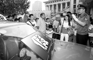 8月10日,在上海陆家嘴地铁广场,交通执法人员向市民讲解辨别真假出租车的方法。当日,“维护乘客合法权益 依法打击‘克隆’出租车”宣传和车辆销毁活动分别在上海浦东陆家嘴地铁广场和宝山拆解工厂举行。新华社发