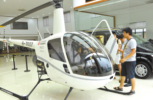 8月11日,市民在中欧飞机公司杭州展厅观看美国罗宾逊公司生产的R22型单发直升机。近日,中欧飞机公司的杭州店投入使用,成为杭州首家正式销售直升机的公司。据了解,目前在中欧飞机公司杭州展厅摆放的是美国罗宾逊公司生产的R22型单发直升机,销售价格为近300万元人民币。新华社发
