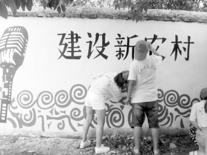 近日,周口师范学院美术与设计学院暑期“三下乡”志愿者来到项城市高寺镇张营村,参加暑期社会实践服务活动。志愿者通过手绘文化墙,既扮靓了农村新貌,又提高了自己的社会实践能力。(刘凯 摄)