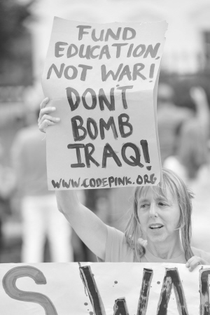 8月11日,在美国首都华盛顿白宫前,一女子举着标语抗议美国总统奥巴马授权空袭伊拉克的行为。新华社发