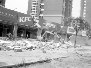 本报讯 (记者 李瑞才文/图) 8月12日上午,淮河路办事处组织40多名城管队员,对交通大道东段进行了突击整治,拆除了长期霸占人行道的多处违章房和临时围墙(如图),并将积攒垃圾全部清运干净。