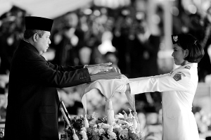 8月17日,在印度尼西亚首都雅加达,印尼总统苏西洛(左)在独立日庆祝仪式上交付国旗。 印尼当日庆祝独立69周年。二战期间,当时作为荷兰殖民地的印尼被日军占领。1945年日本投降之后,印尼领导人苏加诺和穆罕默德· 哈达于当年8月17日宣布印度尼西亚独立。 新华社发