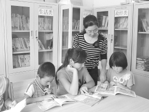 西华县田口乡组织教师放弃暑期休假,利用农家书屋为留守儿童“充电”,丰富孩子们的假期文化生活。图为滩上小学教师正在辅导孩子看书。