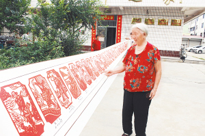 一把剪刀剪出五味人生,一摞红纸铭刻多彩岁月。项城市78岁剪纸女艺人聂素贞,历时13个月,顺利完成了《水浒》剪纸作品。图为聂素贞正在展示该剪纸作品。杨光林 朱宁宁 摄