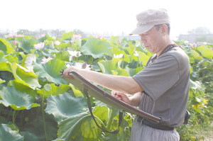 项城市花园办事处积极推进农业示范园区建设,建起了草莓园、荷花园等基地,吸引了大批市民前往采摘或观光。图为一美术爱好者正在荷花园写生。(张永久 摄)