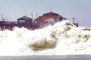 8月27日,在美国加利福尼亚州海豹滩,海浪冲击码头。