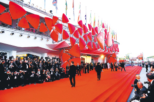 这是8月27日在意大利威尼斯丽都岛拍摄的意大利威尼斯电影节开幕红地毯现场。当日,第71届威尼斯电影节在意大利威尼斯丽都岛开幕。
