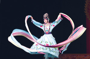8月27日,北京京剧院青年演员窦晓璇在美国华盛顿肯尼迪艺术中心为媒体预演京剧剧目《天女散花》。当日晚,纪念梅兰芳诞辰120周年“双甲之约”美国巡演在美国首都华盛顿精彩亮相。