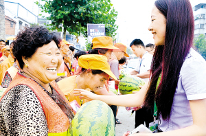 为大力弘扬环卫工人爱岗敬业、甘于奉献的精神,引导广大青少年自觉向环卫工人学习, 8月27日,团市委组织青年志愿者为周口市区部分街道环卫工人送去了爱心水杯和西瓜。 (记者王映 摄)