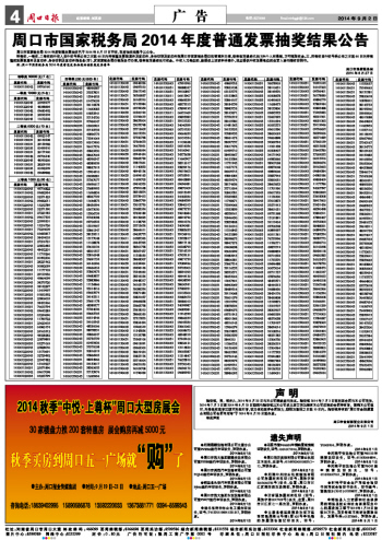周口市国家税务局2014年度普通发票抽奖结果公告
