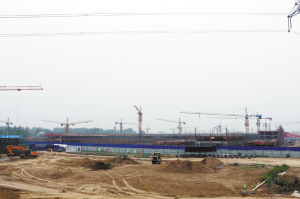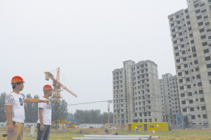 8月26日,华耀城回迁群众在现场查看、监督安置房建设进度及质量。