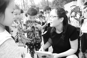 市妇联工作人员正在为孩子们发幼教读物。(窦娜 摄)