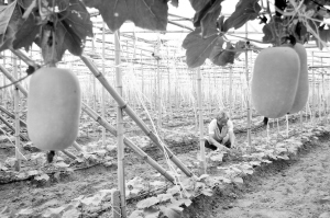 扶沟县绿色阳光合作社建设的1000多亩蔬菜园区,采用水肥一体化、立体种植等形式进行无公害蔬菜生产,实行农超对接、农商(场)对接销售蔬菜,取得了较好的经济效益和生态效益。图为社员正在管理秋延黄瓜。(谷志方摄)
