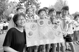 9月10日,夫子庙小学四年一班的学生手持自己制作的教师节祝福海报,和班主任老师合影。当日是教师节,南京夫子庙小学学生举行“祝福老师——庆祝第30个教师节”主题晨会。